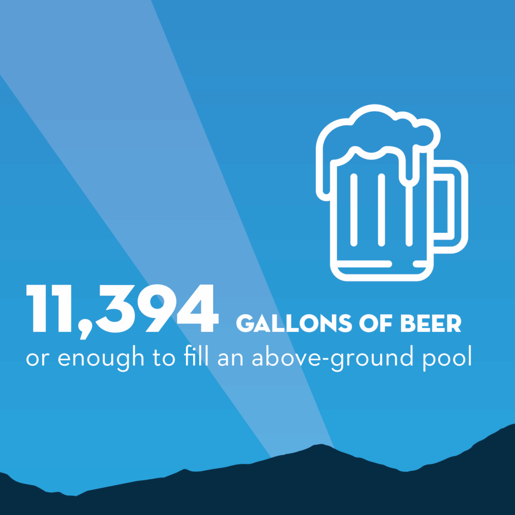 - 11,394 gallons of beer or enough to fill an above ground pool.