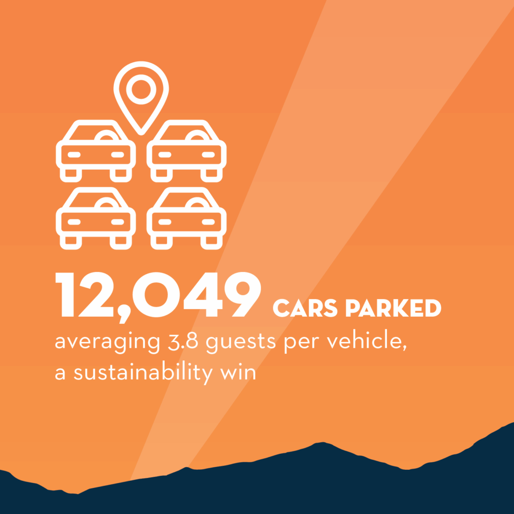 - 12,049 cars parked, averaging 3.8 guests per vehicle — sustainability win.